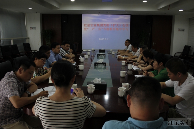 2015年6月11日下午,红星实业集团公司在11楼会议室召开党委(扩大)会议暨“三严三实”专题教育集中学习座谈会。集团公司党委、董事会、监事会成员,司属各企业党支部书记参加,区人大常委会副主任刘海秋、井湾子街道工委书记刘江红到会指导。会议由集团公司党委书记、董事长罗跃主持。