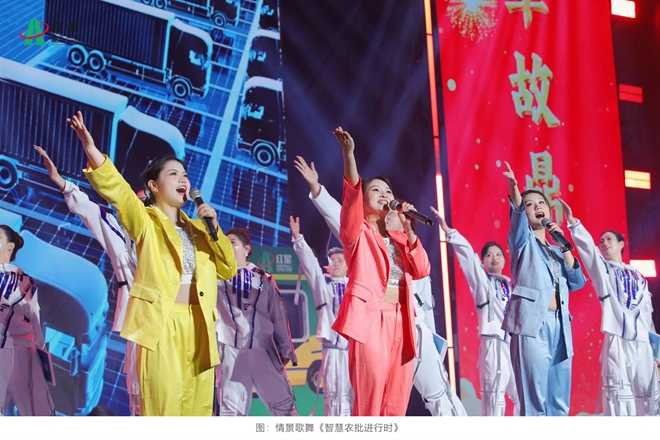 第二篇章“星焕·破界创新”聚焦红星在新时代浪潮中的锐意进取。情景歌舞《智慧农批进行时》以生动场景,再现了锐意改革给传统市场带来的焕新升级;现代舞《星链》用充满科技感和力量感的肢体语言,隐喻红星各产业板块高效协同、聚力创新的发展态势;小品《我要上村晚》则以幽默诙谐的方式,反映了红星人积极参与乡村文化振兴、拥抱新生活的精神风貌。这些节目共同奏响了红星人敢于突破、勇于创新的时代强音。