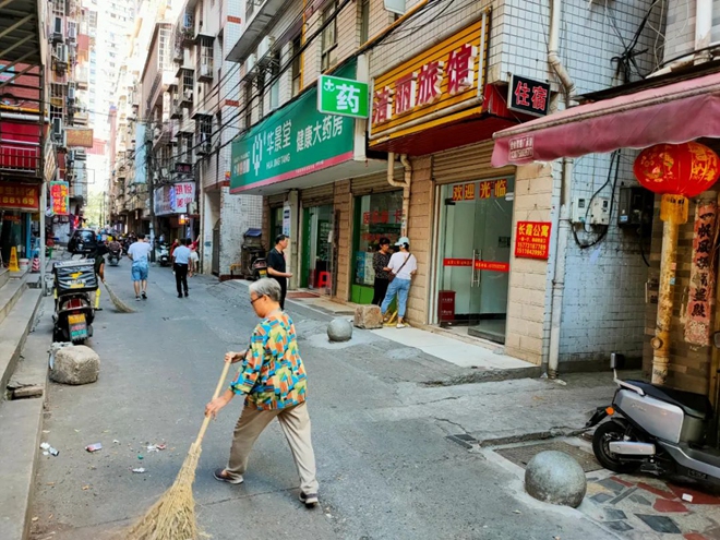 这支劳动大军中既有社区的年轻工作者,也有组级公司负责人,还有一群极富热情的志愿者,其中年过花甲的张淑芳阿姨格外引人注意。张阿姨有着一副热心肠,作为井湾子组的一员,她非常关心组上的公益事业,总是积极主动参与。今天的“洁净红星”行动,她不由分说便加入了志愿者队伍,利落地操起扫帚忙开了。张阿姨行胜于言,从来都是以行动来表达,而她的这股子热情劲和无私奉献的精神,也深深地感染着身边的“红马甲”。