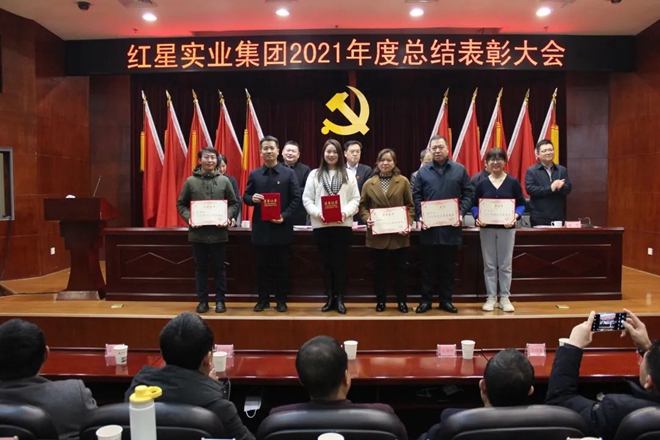 会上,集团董事袁丹宣读了《红星实业集团2021年度评优评先结果通报》,对广西荣顾红星农产品有限公司等6个“先进集体”, 集团人力资源部等3个“创新管理奖”单位,胡超等9位“优秀管理者”,张平等7位“攻坚克难突击手”, 沈丹妮等47位“优秀员工”, 张新明等3位“优秀组级公司管理者”进行隆重表彰,获奖代表张俊、张新明先后作典型发言。