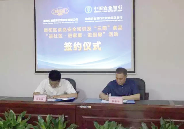 近日,红星实业集团旗下湖南红星盛康生物科技有限公司与中国农业银行长沙雨花区支行就参与“雨花区食品安全知识及‘三同’食品进社区、进家庭、进厨房”活动开展合作。集团副总经理、红星盛康总经理张平灿,农行雨花支行行长孙艳辉等出席签约仪式。
