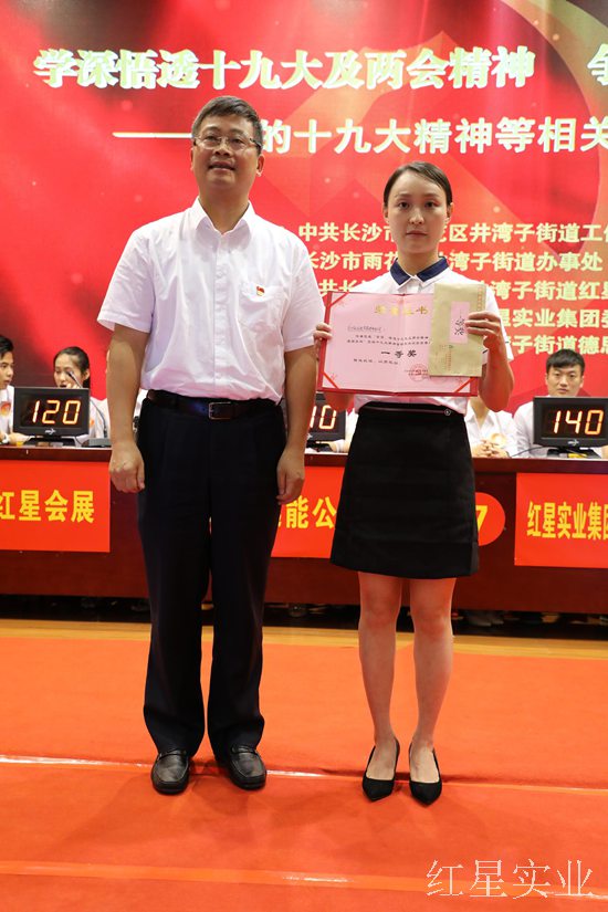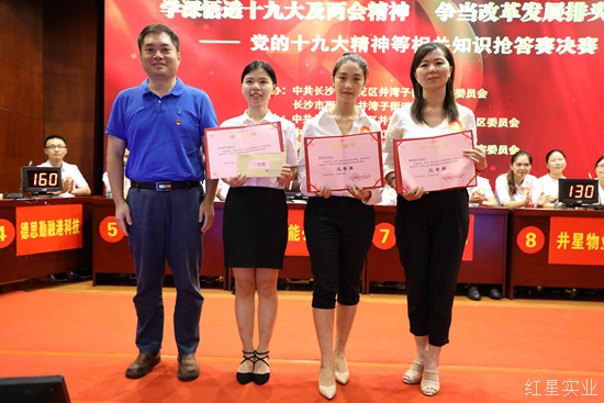 比赛分必答题、抢答题、风险题三大环节,现场气氛紧张激烈,快速反应颇具考验。在穿插进行的互动环节,现场观众参与热情一点也不亚于参赛选手,而风险题环节更是把现场气氛推向高潮。比赛中,选手们表现出色,气氛热烈,表现出学习宣传贯彻十九大精神的满腔热情,充分展现了红星人朝气蓬勃的精神面貌和扎实过硬的基本功。三轮较量过后,永佳公司代表队拔得头筹,红星井湾子家具城、湘德公司代表队荣获二等奖,佳湾公司、德思勤融港科技、红星北盛冷冻代表队获得三等奖,出席领导现场为获奖队伍颁奖。