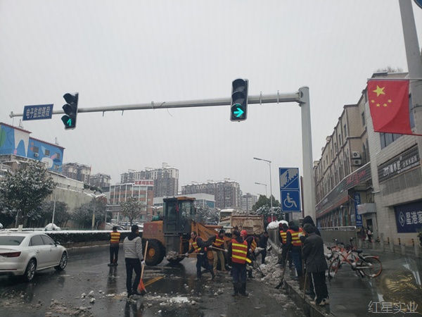 据悉,为确保道路畅通,红星建设继去年义务除雪行动后,再次投入了3台铲车、3台后八轮,出动了上百人的义务清扫队伍,负责湘府路口到雨花亭段韶山南路两厢的铲雪除冰任务,上演了一幕“铲车+后八轮”的除冰进行曲,极大便利了广大市民出行,更收获了社会各界的点赞无数!
